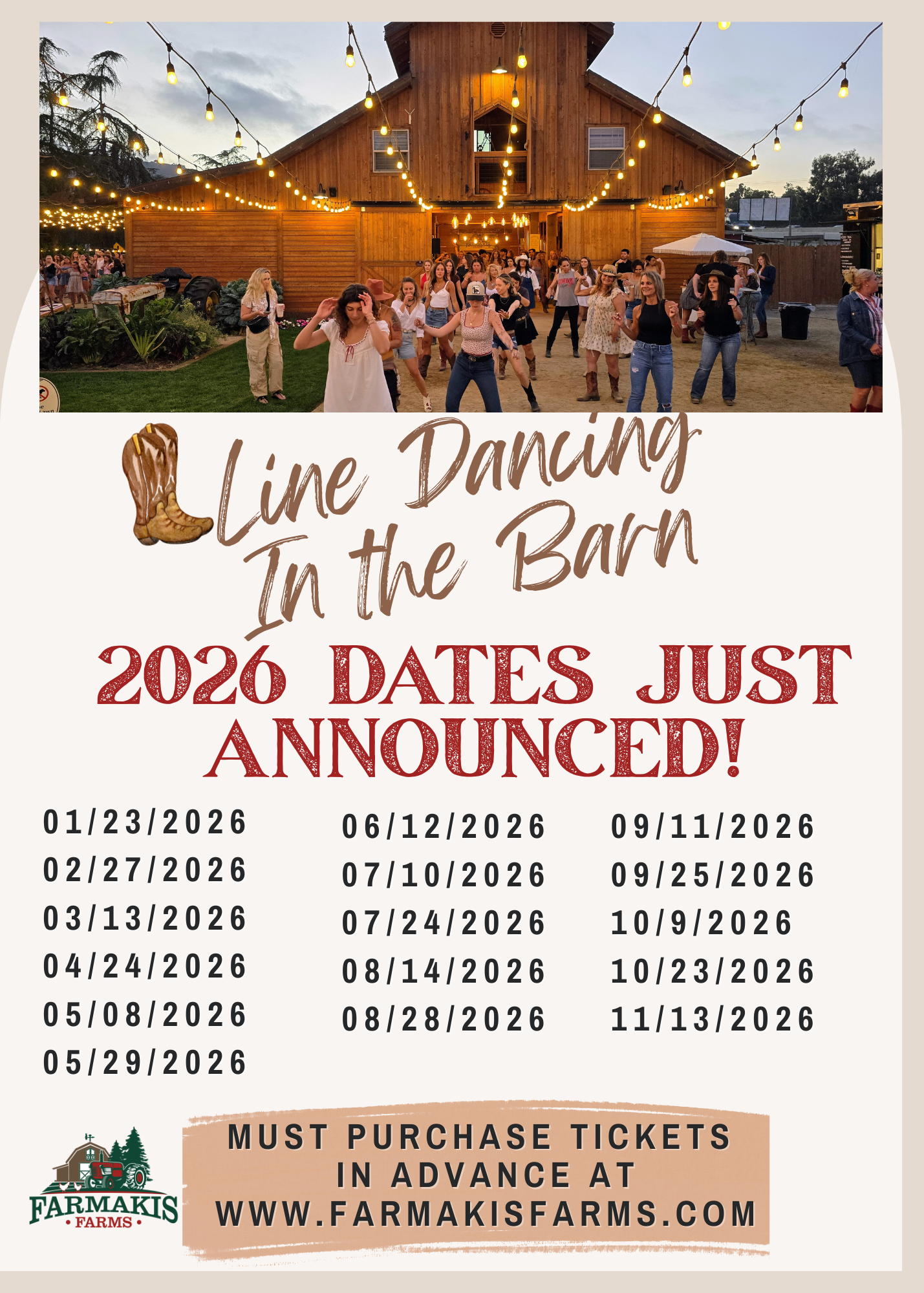 Join us for line dancing in the barn and under the stars!!! Tickets must be purchased online. Event time: 7:00pm-10:00pm.